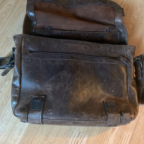 Uutta vastaavassa kunnossa oleva pehmeää nahkaa oleva tietokonelaukku, johon on lisätty suutarilla kantokahva Laukun päälle.