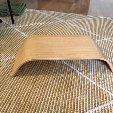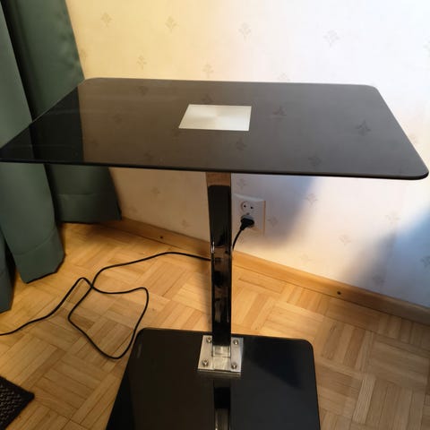 Ikea Bräda -tietokone-/läppärialusta. Pari lohkeamaa pinnassa ja yksi ruuvi puuttuu molemminpuolin, mutta pysyy hyvin pystyssä ja yleisilme ihan siisti. Pöytäosan leveys 43 cm, syvyys 28 cm, kokonaisleveys jalkoineen 55 cm ja korkeus 15-20 cm. Vain nouto.