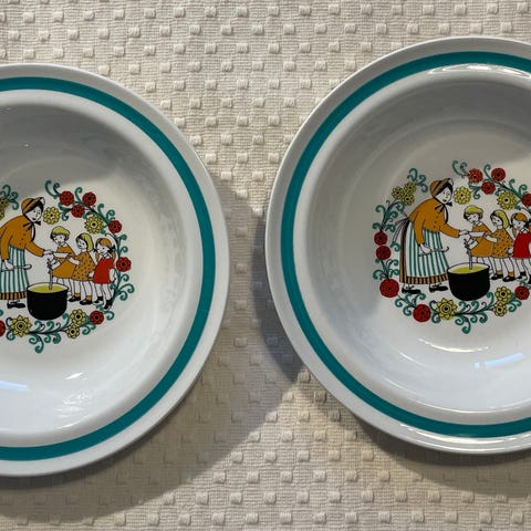 Vanha Arabian lasten lautasten setti . Hyvässä kunnossa,vain tuo "lämmittävä" lautanen krakeloitu.Myydän vain setti.Yht.hinta 90€.