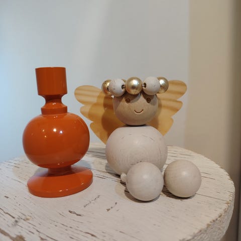 Aarikan puinen punainen enkeli kynttilänjalka. Sopii enkelikellon kynttilälle. Hyvä kunto