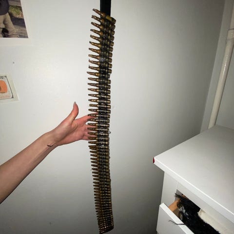 Luodillinen panosvyö, perusvyön pituus 98cm, hinta 90€. Vyötä voi lyhentää tai jatkaa. Jos haluat pidemmän kuin perusmittaisen, mittaa lantiosi ja ilmoita pituus. Lisäpanokset kiinnikkeineen (1 kpl jatkaa vyötä 1,5cm) 1,4€ kpl. Panosten hylsyt messinkiä, luodit kuparia, vyölenkit terästä. Panoksen pituus 7cm. Postitus 8,90€