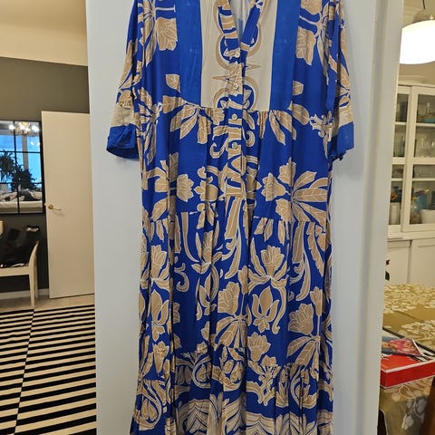 Laskeutuvaa kangasta oleva, tyylikkäästi kaavoitettu mekko. Helma 177 cm pitkällä käyttäjällä pohkeeseen. Vyö, kauniit hiha- ja kauluksen yksityiskohdat.