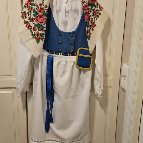 Siisti naisten kansallispuku,liivihame,paita,essu.huivi ja punainen nauha.puku valmistettu Lahden kansanopistossa 1935 - 1936 ,puku ollut aina samassa suvussa.kokoa en tiedä,mutta käyttäjä ollut 165 cm pitkä.