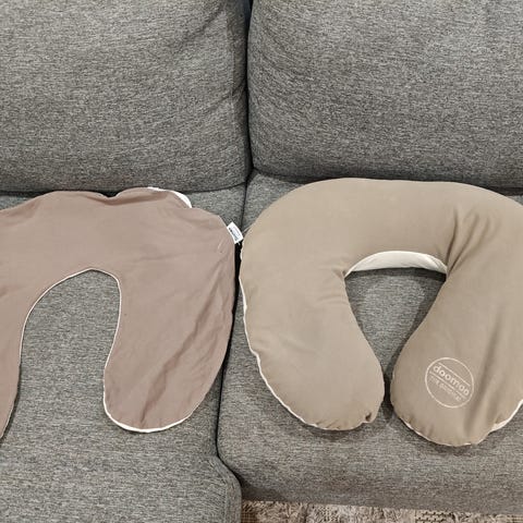 Siisti Doomoon imetystyyny. Irroitettava päällinen ja tyynyyn mahdollista ostaa lisätäytettä. Päälliskankaan sauma yhdestä kohtaa vähän purkaantumassa.