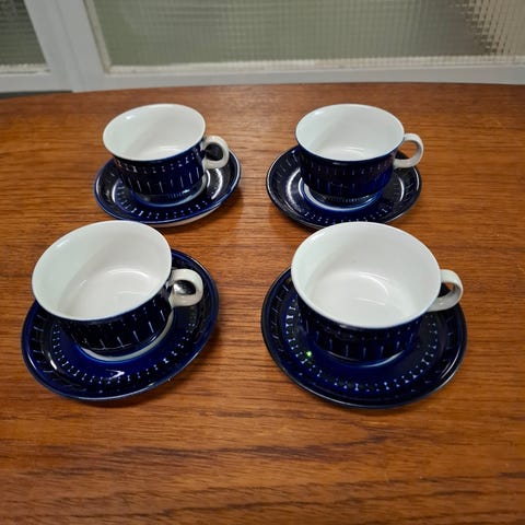 Kupin halkaisija 7,5cm ja korkeus 4,5cm, asetin halkaisija 11,5cm. Suunnittelija Ulla Procope, olleet tuotannossa vuosina 1960-2002.