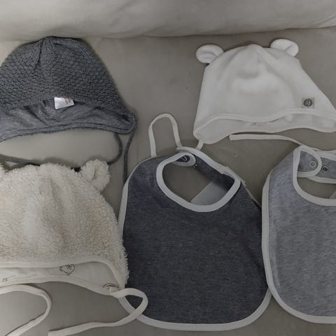 Vauvan kankainen ruokaliina. Kerran käytössä ollut ja pesty sen jälkeen. Voi olla, että on kellertävää tullut ruokaliinaan, kun katsoo hyvässä valaistuksessa.