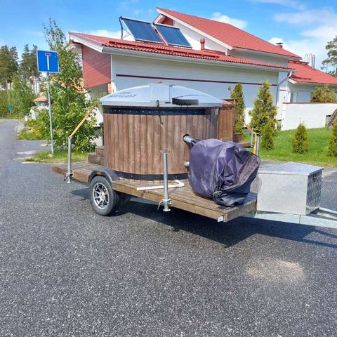 JJ-trailerin alustalle rakennettu PW-SPA 1700mm kylpytynnyri tehokkaalla kaminalla. Rakennettaessa molemmat siis uusia, nyt n 2 vuotta ikää, mutta vain kaksi kertaa käytetty. Ei ollut kuitenkaan mun juttu, siksi luovun.