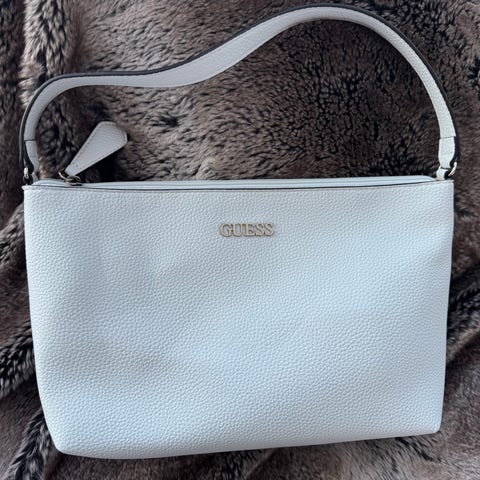Musta reikäkuvioinen guess olkalaukku. Pienempi laukku on sisällä jossa on vetoketju.