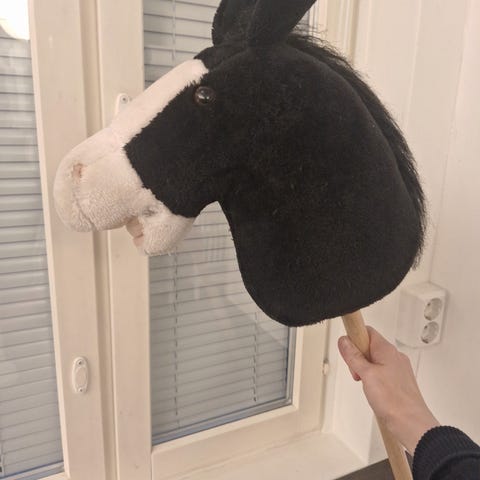 Valkonen kuvan mukainen keppihevonen.