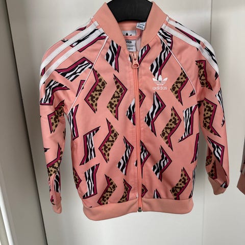 Adidaksen vetoketjullinen collegetakki + housut, koko 92 cm. Takissa sivutaskut, hihoissa ja takin reunassa resorit. Housuissa vyötäröllä kuminauha ja lahkeissa resorit.