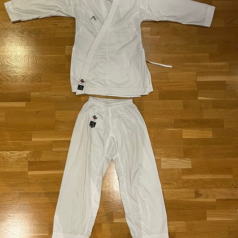 Hyväkuntoinen ja siisti Kwon karatepuku kumiteen ja kataan. Paksu kangas, luultavasti 12oz. Kauluksessa vähän tummentumaa muttei juurikaan näy. Lähtenee ehkä kloriitilla pois.