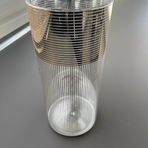 Lasinen maljakko. Tausta on peilinen, etuosa lasinen. Maljakko on päällystetty valkoisella pinnoitteella, ja joistain kohdista pinnoite on kulunut pois.