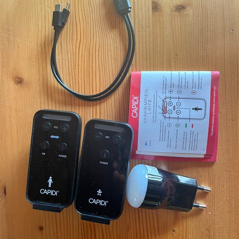 Capidi itkuhälyttimet, edelleen hyvässä kunnossa. Myös värinätöiminto, kätevä jos aikuisen kappaletta pitää vaikka taskussa. Saa myös takana olevalla klipsillä vaikka kiinni vaatteeseen. Hyvä kantama ja toimii langattomasti. Kuvassa näkyvät laturit mukaan.