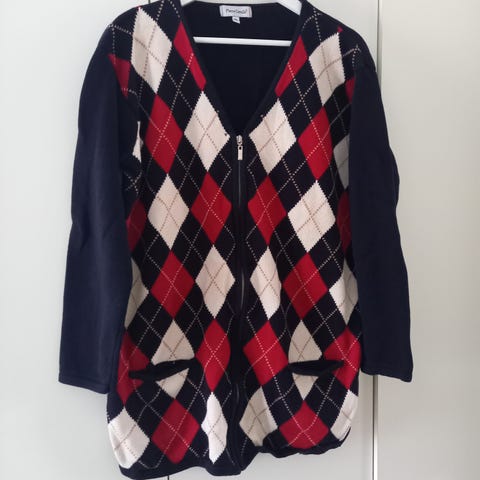 Pikimusta, edessä taskut, viskoosi-nylonia, pehmeää ja joustavaa neulosta. Ei kovin paksu, mukava päällä.