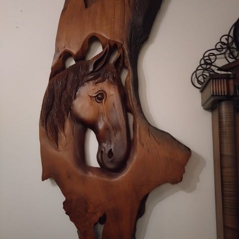 hevosenvaljakko ja vaunu koriste-esine, valmistettu puusta ja metallista. Sisältää neljä hevosta, vaunun ja kuljettajan. Esine on kiinnitetty punaiselle alustalle, joka on asetettu puiseen kehykseen. Sopii koristeeksi tai keräilyesineeksi.