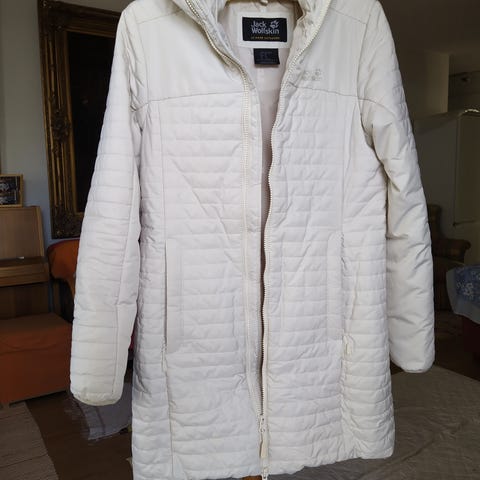 Jack Wolfskin talvitakki naisille, koko XS. Takki on harmaa. Takissa on vetoketjullisia taskuja ja säädettävä huppu, joka suojaa tuulelta ja sateelta.