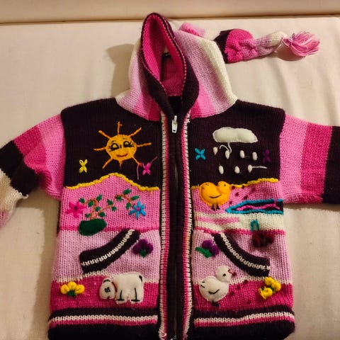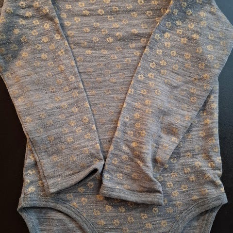 Uutena ostettu ja yhdellä lapsella ollut, juuri pesty huolellisesti hajusteettomalla pesuaineella (Nikwax villa pesuaine "wool wash"). Myynnissä myös sininen versio (isompi).
