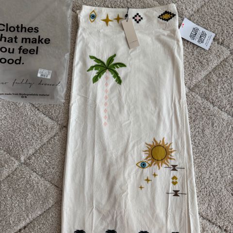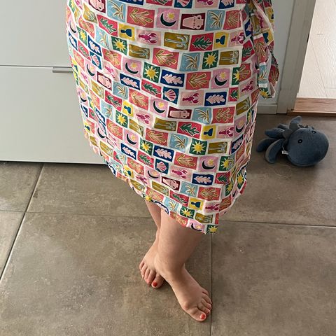 Kuosillinen kietaisuhame 100 % puuvillaa, koko säädettävissä XS-M, kankaan yläosan kokonaisympärysmitta 100 cm. Väreinä turkoosi, valkoinen, persikka ja punainen, vyötärökaistaleen kuosissa lisäksi ruskeaa. Kanttaukset korallinväriset. Kunto uutta vastaava, tehty käsityönä Espanjassa. Tuplanauhojen ansiosta pysyy hyvin päällä! MMM