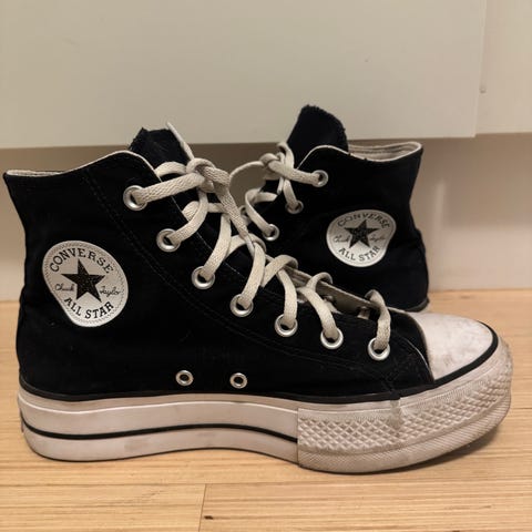 Myydään Conversen Chuck Taylorin vaaleanpunaiset (ei hailakka, lähempänä neonpinkkiä luonnossa) platform-tennarit koossa 39. Käytetty muutamia kertoja, käyneet pesukoneessa, tummentumat saa hinkattua halutessaan vaikka hammastahnalla kokonaan pois. Siistit, kevyet ja todella mukavat jalassa. Semi-leveä lesti. Mittoja: Sisä 26cm, ulko 30cm, pohja 5cm, pohja-varsi 17,5cm. Oma jalka n. 25cm pitkä ja kengät istuu hyvin.