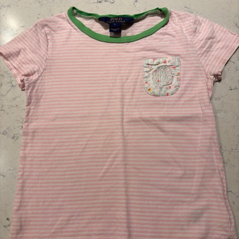 Muutaman kerran käytetty vaaleanpunainen Polo Ralph Lauren t-paita. Koko 5v.