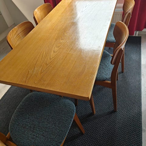 Pöytä suomalaisen huonekalutehtaan valmistama, sieltä hankittu 1984, leima pohjassa. Kunto moitteeton, kuin uusi. Mitat 140x100x74cm. Jatkettava, 40cm:n lisäkappaleella.