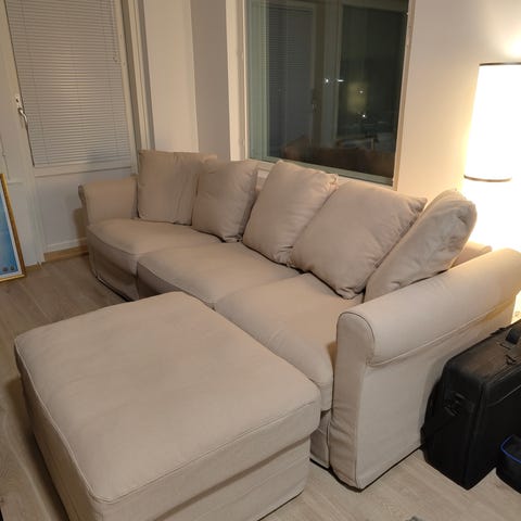 Kerran kasattu mutta käyttämättömäksi jäänyt ja sen jälkeen jälleen lämpimään varastoon pariksi vuodeksi purettu IKEAn Råvaror sohva, jota voi myös käyttää vuodesohvana. Kunto hyvin lähellä uutta ja kaikki osat tallessa. Tyynyt ja niiden päälikankaat tulee mukana kuten kuvassa, sekä patjan päälikangas, mutta uuden tapaan ei sisällä patjaa, vaan se pitää hankkia itse (kaikki tavanomaiset 90x200 patjat käy, ohuita voi joutua laittamaan kaksi päällekkäin).
