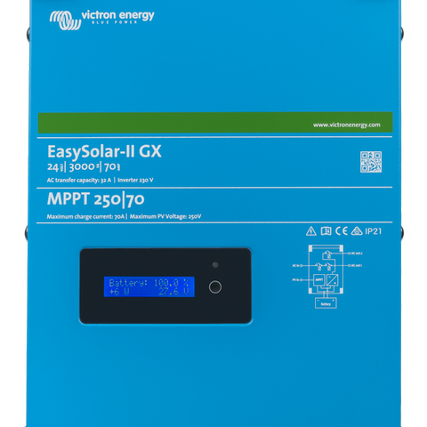 Victron EasySolar 12/1600/70-16 MPPT 100/50 on kompakti ja monipuolinen aurinkoenergiajärjestelmä, joka yhdistää MPPT-aurinkolataussäätimen, invertteri/laturin ja AC-jakelun yhteen yksikköön. Tämä kaikki yhdessä -ratkaisu on suunniteltu helppoon asennukseen, sillä se vaatii vain vähän johdotusta ja eri komponentit toimivat saumattomasti yhdessä.