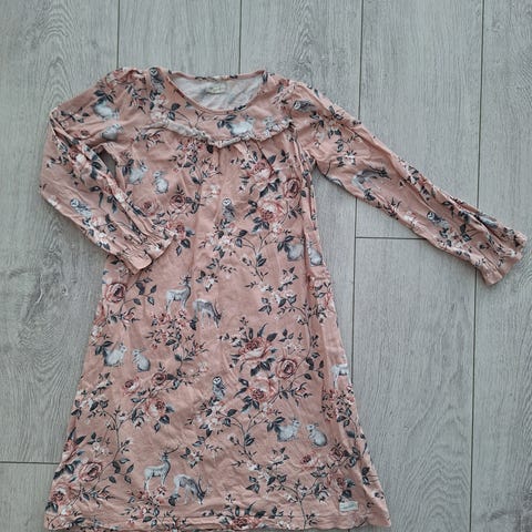 Hyväkuntoinen ja pehmeä Newbie kaksiosainen pyjama, jossa ruusuaiheinen kuviointi. Koko 122/128. Valmistettu luomupuuvillasta.