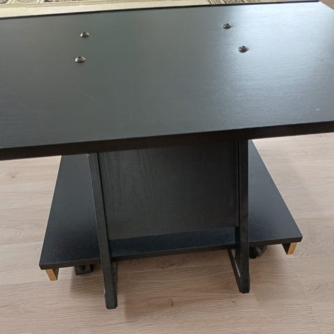 Punapyökkinen tv-pöytä käännettävällä tv alustalla.