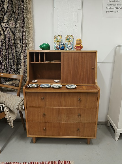 Tyylikäs ja siistikuntoinen jatkettava pöytä. Lievää pintakulumaa jaloissa. Pöytätasossa vähäisiä käytön jälkiä. Mitat jatkopalalla, taso 160cm x 78cm ja korkeus 73cm. Taso ilman jatkopalaa 114cm x 78cm. Kysy kuljetusta!
