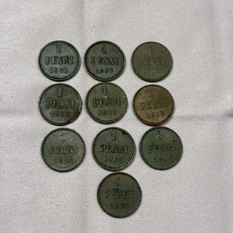 Olisi halvalla myynnissä Suomalaisia 1, 5, ja 10 pennin kolikoita. Al, Mg. 1 penni vuodet 1969-1979. 5 penniä v. 1977-1990. 10 penniä v. 1983-1990. Kunto hieman vaihtelee. Hinta alkaen 0.25€