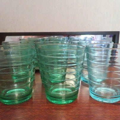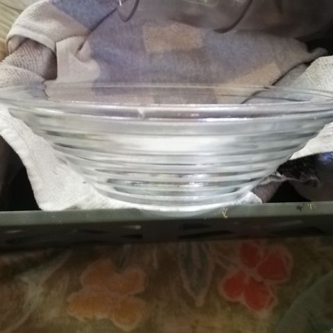 Kirkasta lasia setti. Hyväkuntoisia, normaalia käyttökulumaa. Kaatimen korkeus 17.2 cm, pikkulautasten (4 kpl) halkaisija 13.7 cm.