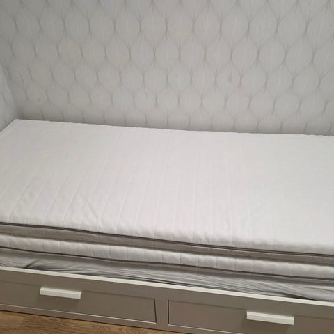 Yhdistelmäpatja. Vaahto ja jouset. Patjan pääreuna on kissa hieman naarmuuntunut