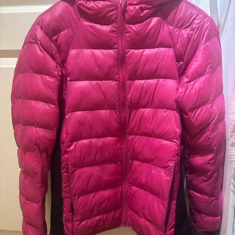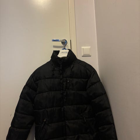 Lyhyt tummansininen takki talveen kiiltävää materiaalia, Vero moda. Hihoissa peukalokolot, säädettävä kiristys vyötäröllä, taskut, kaksi nappiriviä edessä, huppu.