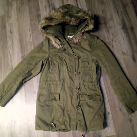 Väri vihreä, musta vuori, musta karva kauluksessa. Takki on lämmin, tikkivuori ja teddy karva takin yläosassa kts kuva.