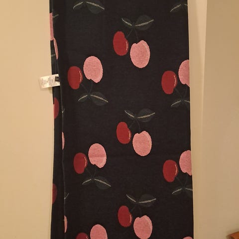 Iso Nosh jakardikangasta oleva huivi, pohjaväri musta, kuviot vihreä/vaaleanpunainen. Käytetty pari kertaa, moitteeton kunto. Koko 68 x 194 cm.