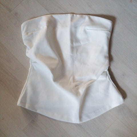 H&M:n olkaimeton toppi, jossa rintojen kohdalla tukiliivi. Pituus 48 cm.