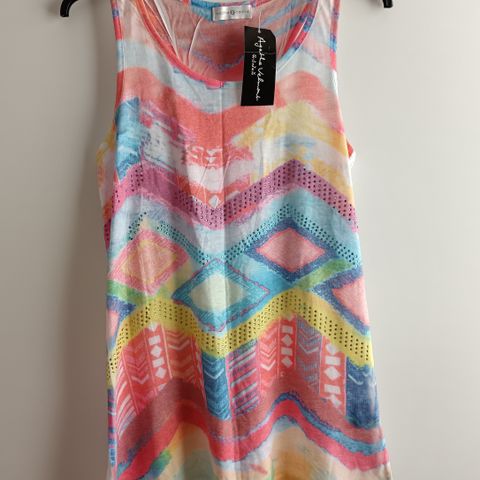 Todella erikoinen farkkukankaalta näyttävä pukeutumispaita, ostettu Espanjasta tavaratalosta. Jäänyt miltei käyttämättä vaatepaljouden takia. Ihana kevyt materiaali, vähän muuta kuin perus t-paidat. Hienoja aksentteja, täynnä erivärisiä strasseja ja kimalletta. Ei varmasti tule toista samanlaista vastaan. Polyester 95 % ja ripaus elastaania (5 %), joten mahtava matkavaate (ei rypisty!)