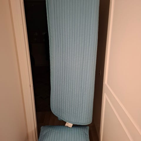 Päiväpeitto norsukuviolla, koko 135 cm x 92 cm ja jättityyny seeprakuviolla, koko 68 cm x 71 cm. Tyynyn kulmissa tupsut. Molemmat samaa materiaalia.