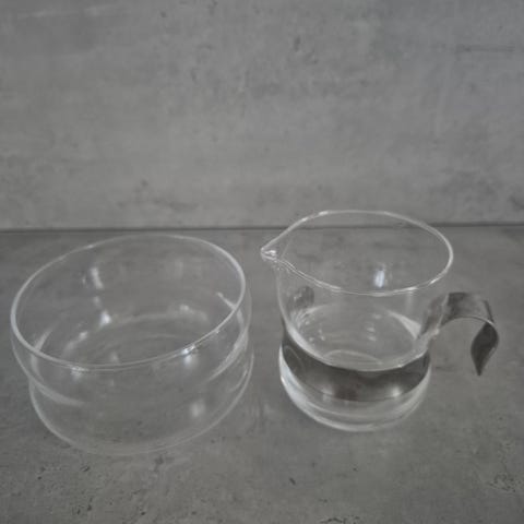 Kuvan kromattu sokerikko ja kermakko aluslautasen kanssa.