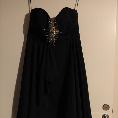 Haloselta ostettu musta, pussihelmainen juhlamekko, jonka merkki on Trendy Look. Kangas on kiiltävää satiinia, jossa on 62 % puuvillaa, 35 % polyesteriä ja 3 % spandeksia. Vuorikangas on 100% polyesteriä. Mekossa on säädettävät naruolkaimet, sivulla vetoketju, takana rinnanympäryksessä kuminauhavenyke ja edessä koristeena iso rusetti.