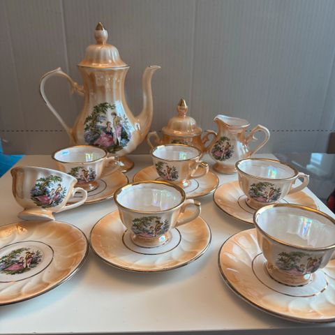 Elizabethan englantilainen valkoinen posliiniastiasto, jossa kullatut reunat.