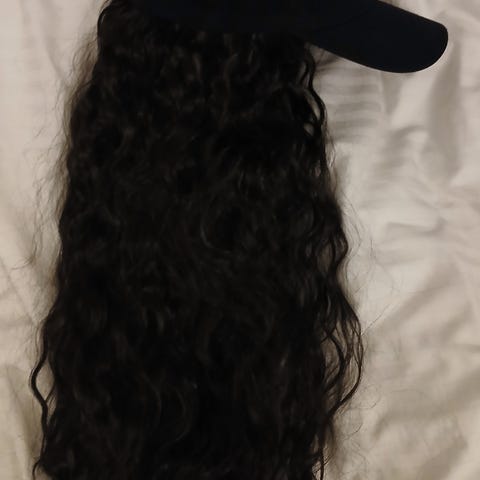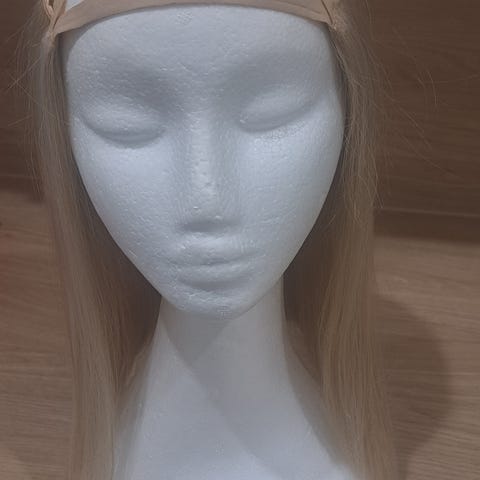 Hiuslisäke, puoliperuukki, hiuspanta? Eli hatun tai lippiksen tai baskerin kanssa käytettäväksi tarkoitettu. Etuhiukset on kiinni tarralla, eli voit käyttää niillä tai ilman. Belle Madame merkkinen, keinokuituinen. H. Kuokkanen peruukkiliikkeestä. Vaalein väri jota tätä oli tarjolla. Luonnollinen elävä väri. Tämä oli vain tunnin mun päässä. Osoittautui pieneksi. Mun pää on 58cm eli 57cm päähän tai pienempään olisi hyvä. Joustaa, mutta 58cm päässä kiristi kuitenkin liikaa, jotta olisi ollut miellyttävä pitää. Meillä ei ole lemmikkejä. Hajuton koti. Lähetän alkuperäisessä laatikossa eli S- koon paketissa 7,90.