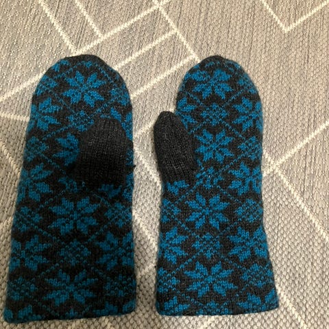 Uudet, käsin kudotut sinisävyiset lapaset. Miehen käteen sopivimmat.
