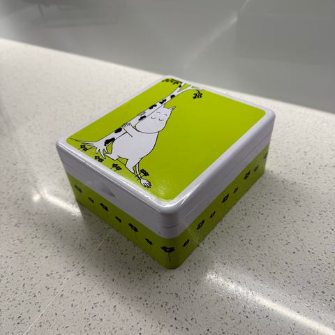 Myydään peltinen Muumi (Moomin by martinex) tee laatikko. Kannessa joitain jälkiä jotka ei lähtenyt pyyhittäessä pois.