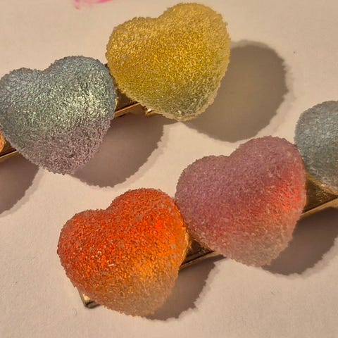 Kaksi erilaista hiussolkea/pinniä simpukkakoristein. Pinni on kullan värinen