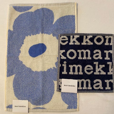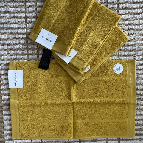 Kaksi hyväkuntoista Marimekon vieraspyyhettä. Olleet vieraskäytössä. Pesukertoja on kertynyt, mutta ovat yleisilmeeltään edelleen siistit ja ehjät. Kutistuneet jonkin verran pesuissa, nykyinen koko 45x28/29 cm.
