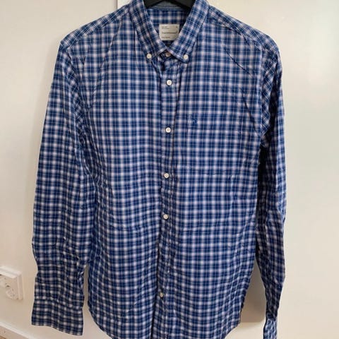 Sininen kauluspaita, kunto erinomainen. 100% puuvillaa. Säilytyksestä rypyssä.
