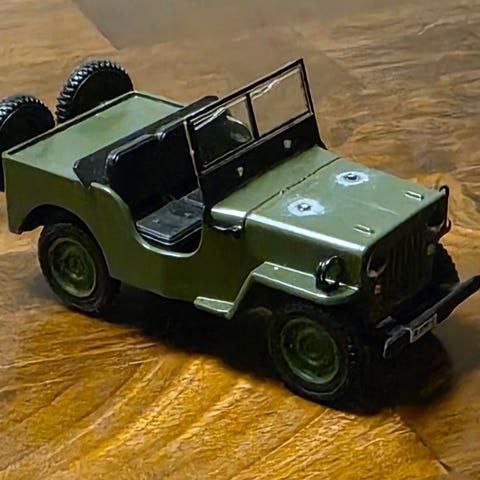 Sotilasajoneuvon pienoismalli omassa laatikossaan.