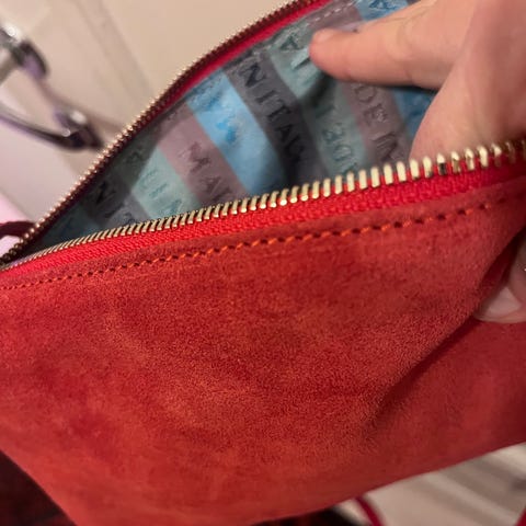 Hyvä kuntoinen. Ei noin kirkas kuin kuvissa, reunoissa hieman tummentumaa, en ole koittanut poistaa. Hyvin tilava, 2 eri "osastoa", itsellä hihna yltää myös crossbodyksi.